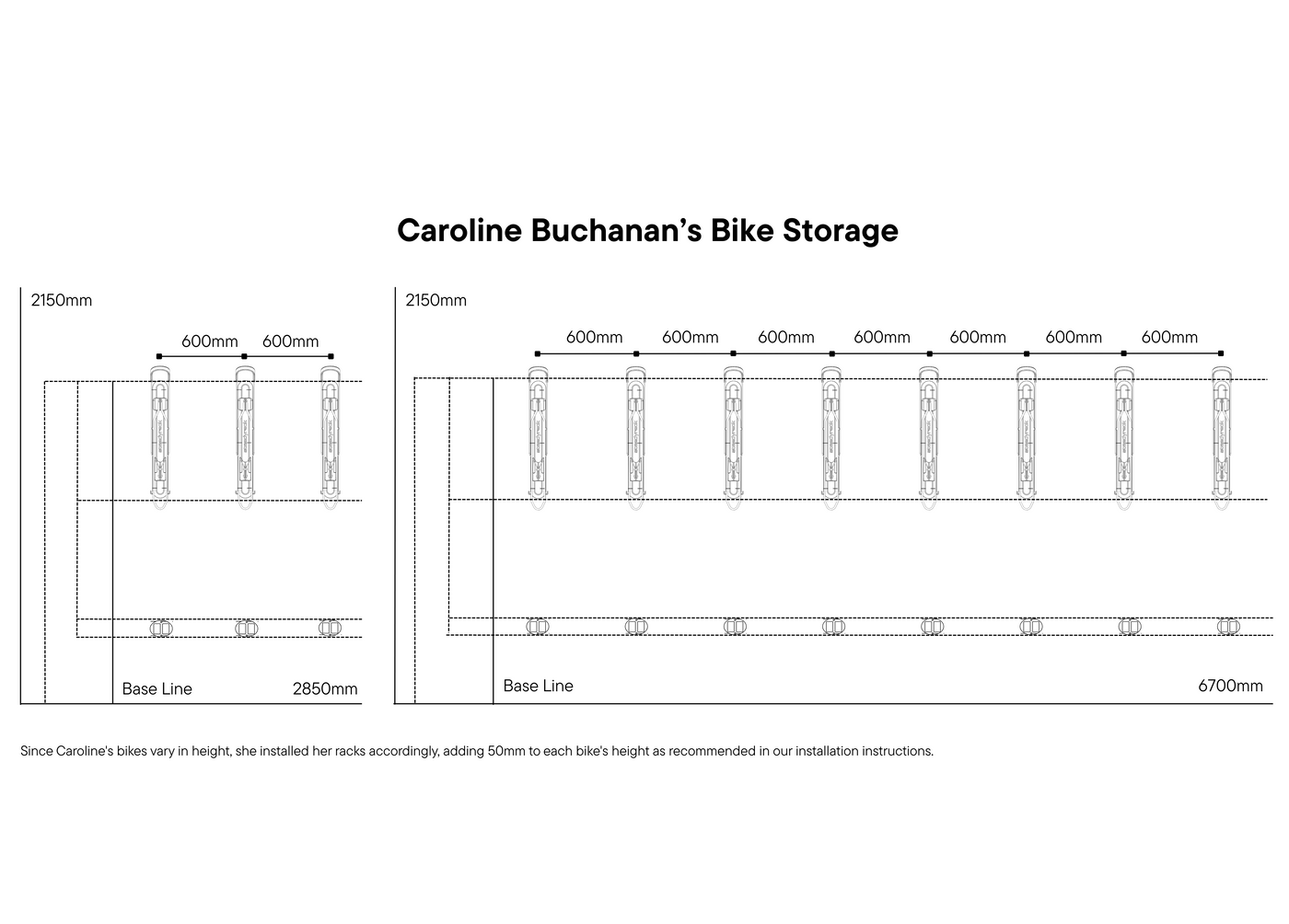 Caroline has installed a total of 11 racks spaced 600mm apart across two wall spaces in her garage. With a collection of different bike styles, Caroline has mounted each rack, adding 50mm to each bike height as recommended in our installation instructions to determine the optimal mounting height.