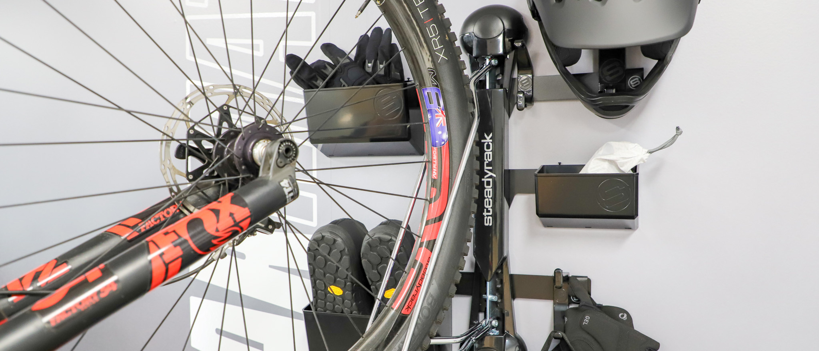 Wall-mounted storage system with a Steadyrack bike rack installed on a wall with accessories stored